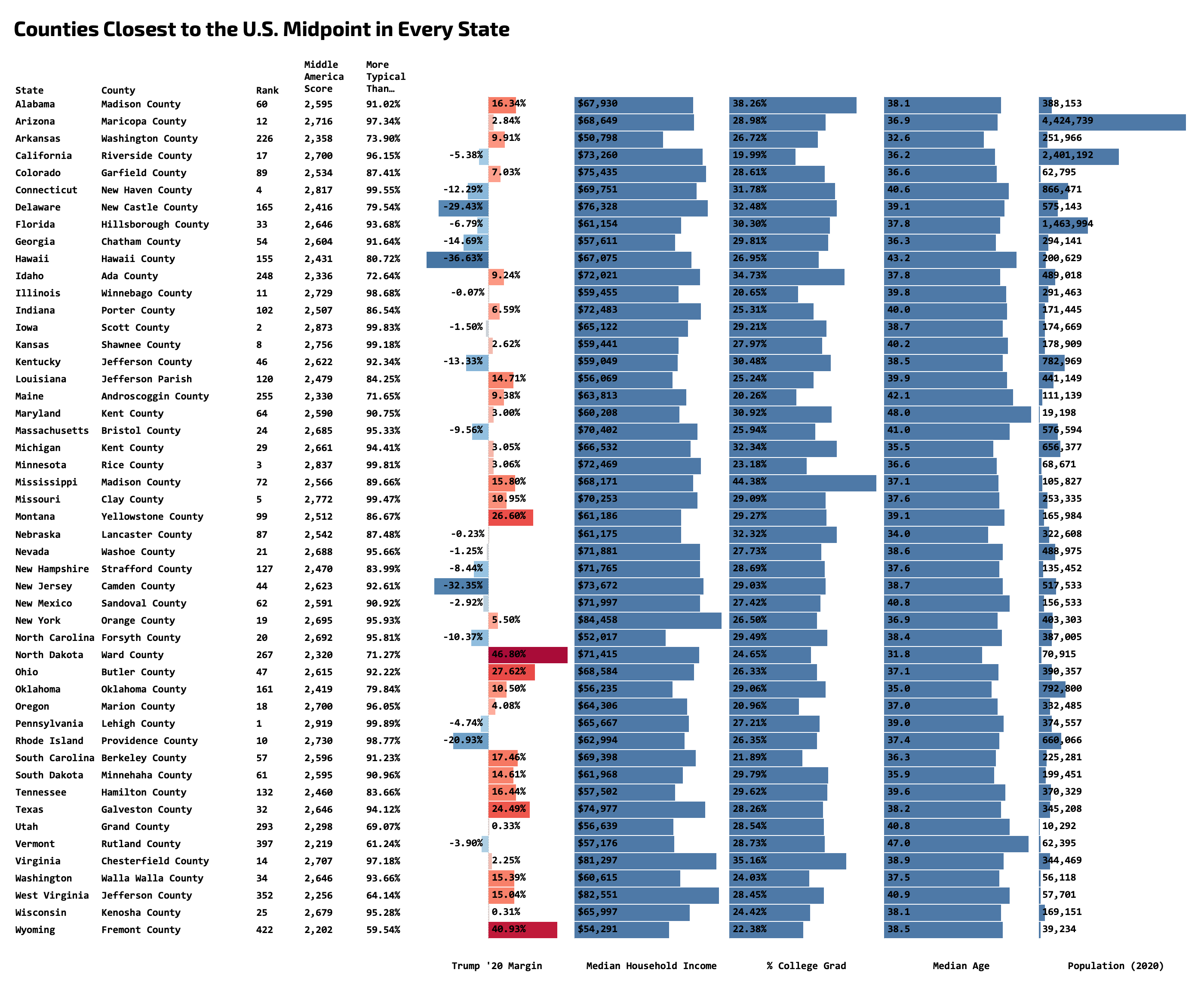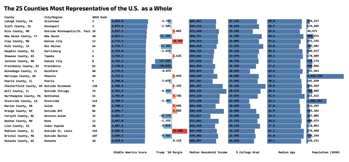 In 2018, we introduced the Middle America Project to answer just this question. We hoped to find the New Peorias, using data to answer which counties were most representative of the country as a whole. We merged data on election, income, education, race, religion, and more to score each county on how representative it is of the United States as a whole. Today, we’re updating the Middle America Project to reflect the most recent Census data and the results of the 2020 Census and the 2020 Presidential election.