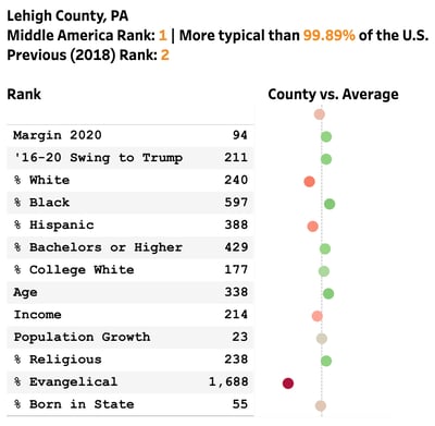 Lehigh County voted for Joe Biden by 7.6 points in 2020, close to his national victory margin of 4.5 points. Its median household income of $65,667 closely matches the national median of $68,799. On all measures except the percent of adults who identify as Evangelical, Lehigh County ranks within 600 places (out of more than 3,000 counties) of the national average.